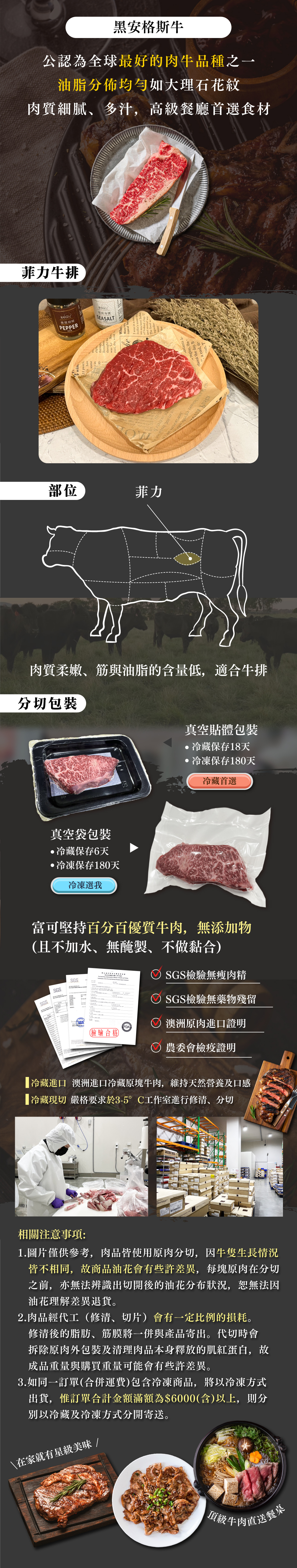 品名:澳洲黑安格斯菲力牛排重量:150g冷藏保存方式:冷藏7°C以下保存冷凍保存方式:冷凍-18°C以下保存牛肉原產地(國):澳洲負責廠商:富可食品企業有限公司地址:高雄市三民區九如三路77號電話:(07)-311-2706